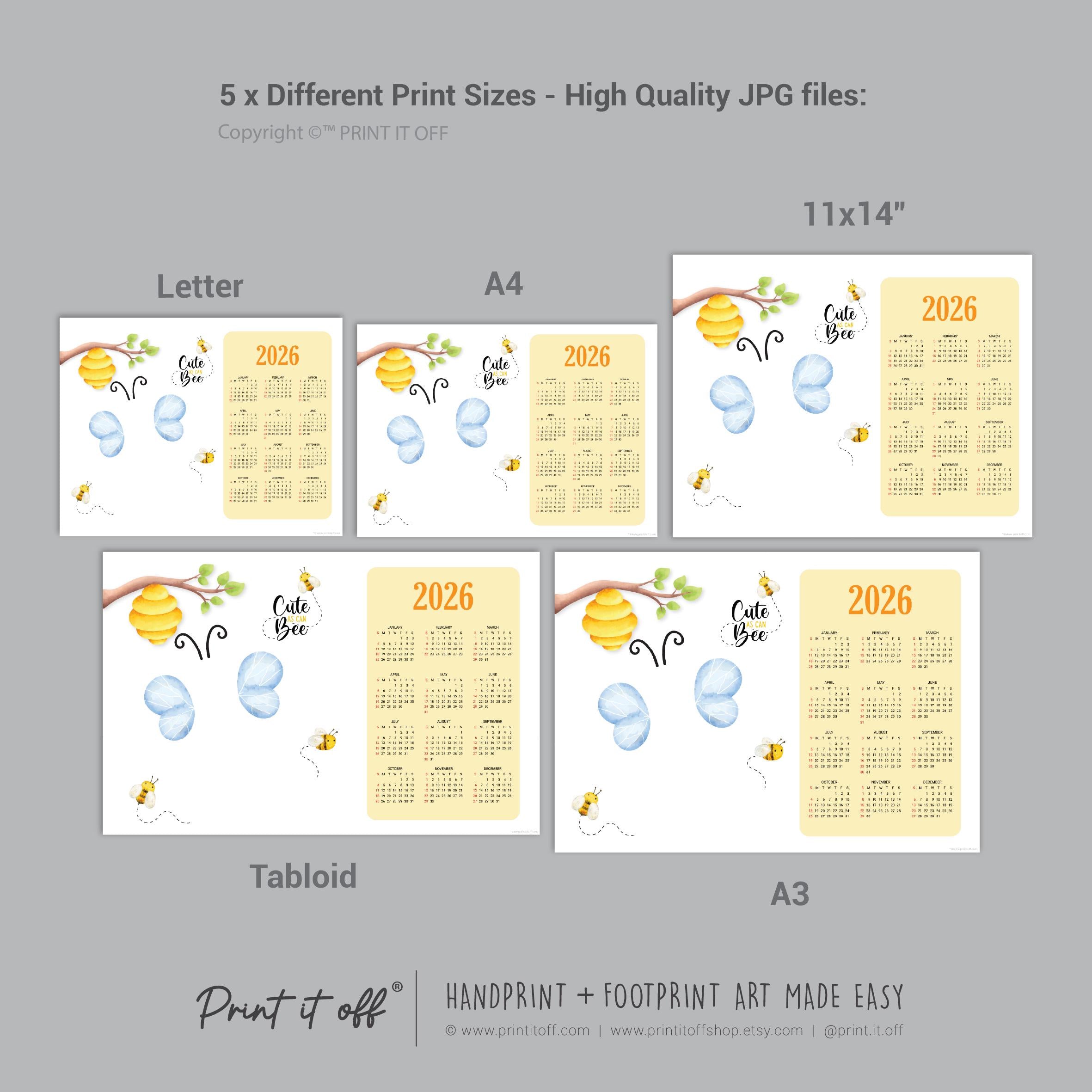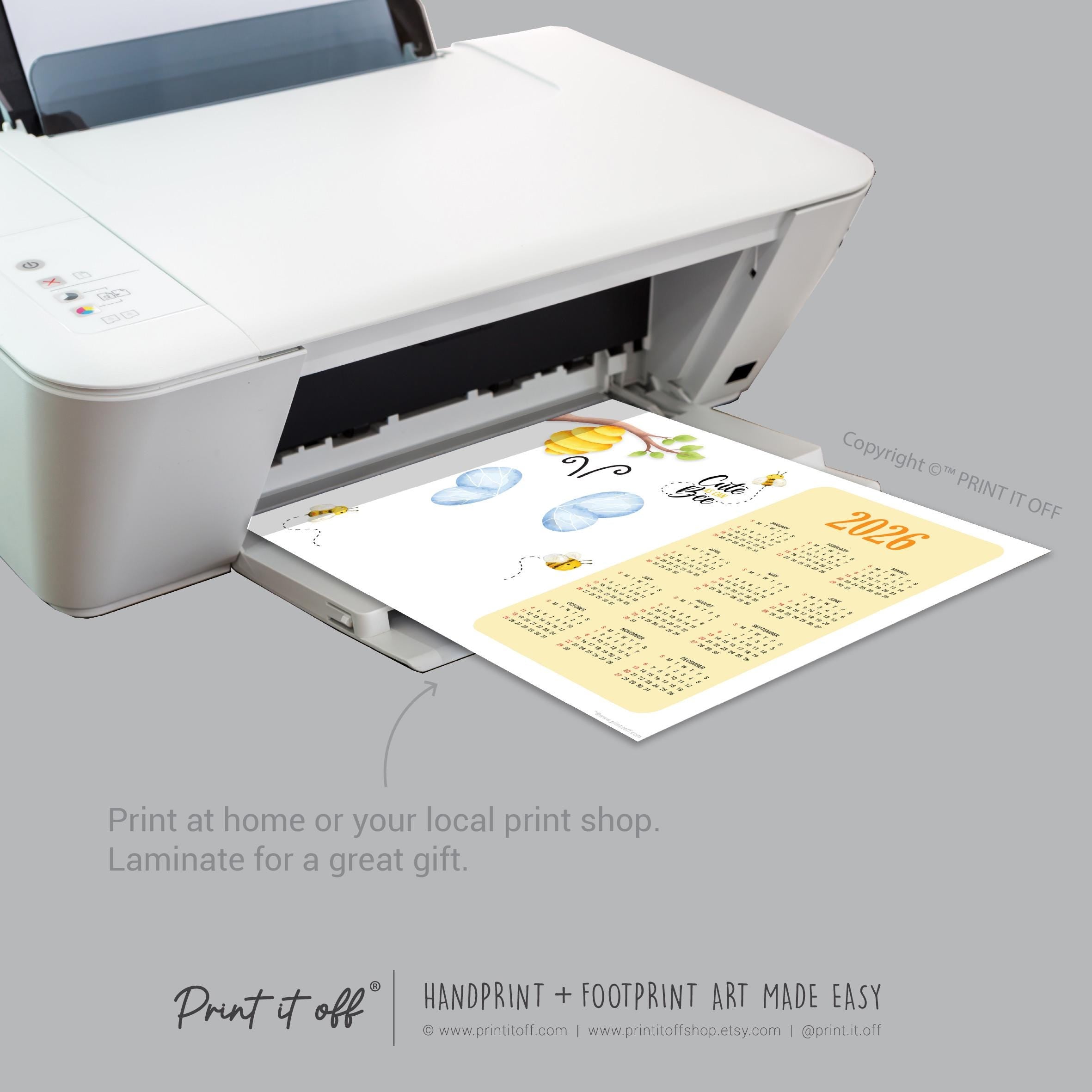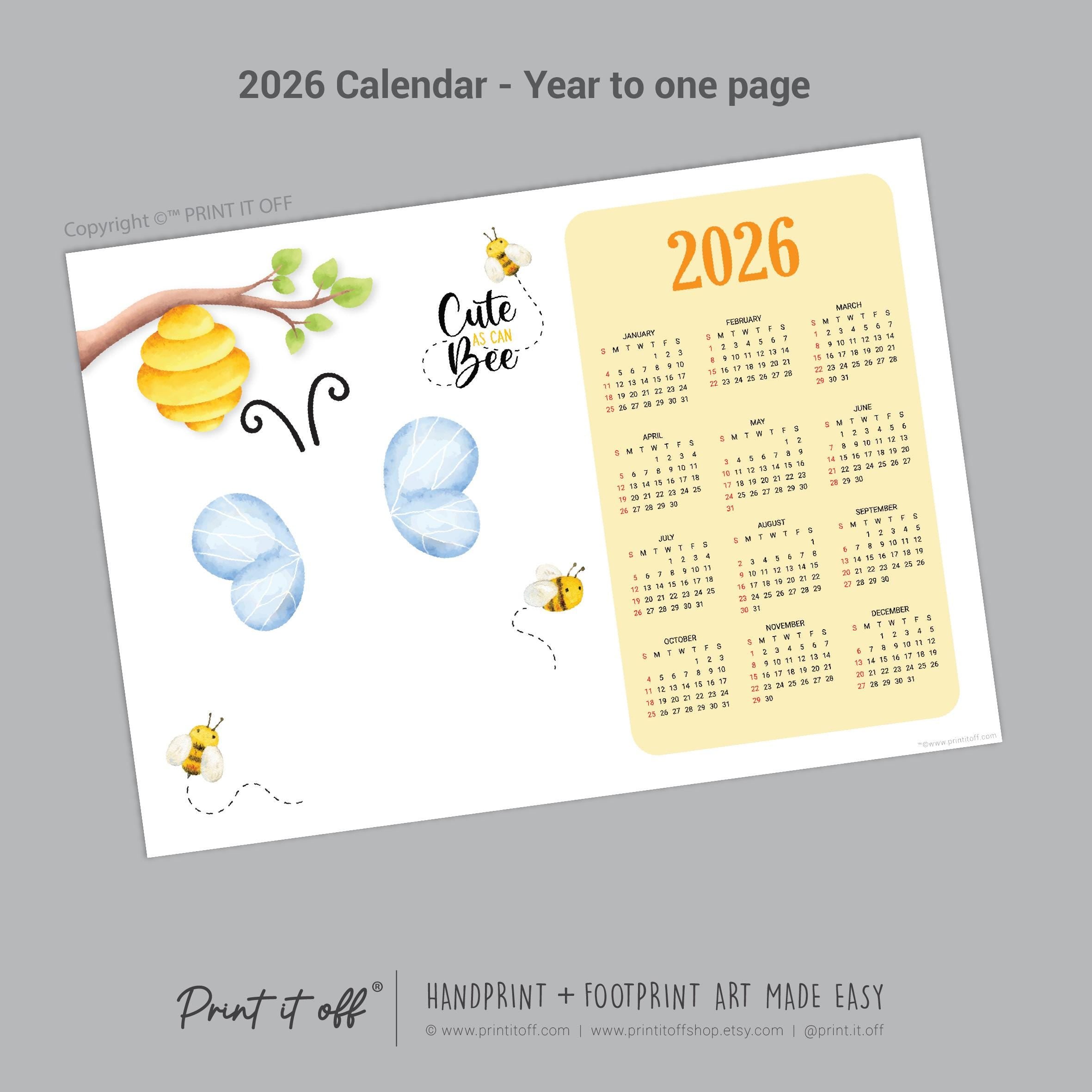 Cute Bee 2026 Calendar Year - Footprint Art Craft Printable Keepsake Gift Template - PRINT IT OFF 0909
